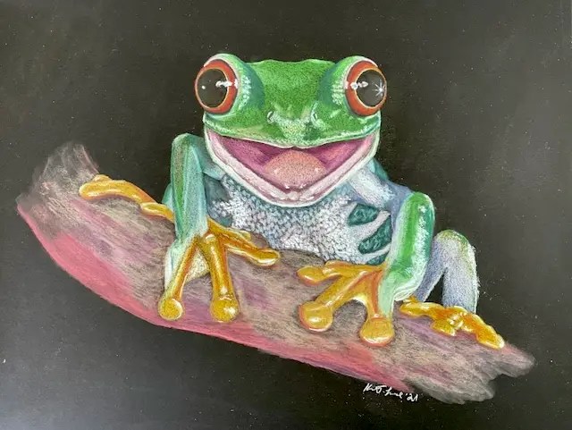9×12 colored pencil piece of a cute little tree frog, using Derwent lightfast colored pencil, faber castelle polychromos, and acid-free Fabriano paper